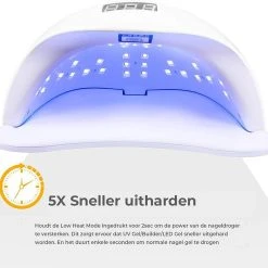 Onze nageldroger zorgt ervoor dat alle nagels tegelijkertijd klaar zijn, dit komt doordat onze nageldroger is voorzien van een dubbele golflengte technologie (365 nm en 405 nm). De nageldroger kan gebruikt worden met onder andere de volgende soorten gel: topcoats, hard gels, builder gels, basecoats en nog vele meer! De nageldroger biedt de opties low heat functie aan en double power functie.