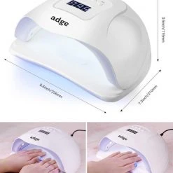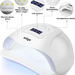 Met de NIEUWSTE nageldroger van Adge kan je je nagels 5x sneller en beter laten drogen dan normaal! De nageldroger is voorzien van 36 sterke 54 Watt LED UV-lampen en kan voor alle soorten gel nagellak en gel polish gebruikt worden! De dubbele golflengte technologie die in de nageldroger zit zorgt ervoor dat de topcoats, basecoats, builder gels of gel polish altijd een goede binding zullen krijgen. De nageldroger is voorzien met een bewegingsdetector, de lamp zal automatisch aan gaan zodra u uw hand/voet erin doet. Deze nageldroger kan voor vingers- en teennagels gebruikt worden, dankzij de verwijderbare onderkant.