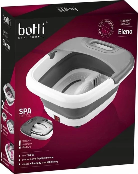 Ontspan na een lange dag. Het merk Botti biedt de Elena voetmassage aan . De behuizing is gemaakt van siliconen. Hierdoor kan het toestel worden ingeklapt, wat het opbergen een stuk makkelijker maakt . De voetenbad heeft de functie van vibratie- en bubbelmassage, waardoor u ontspant en vermoeide voeten verlicht. De uitsteeksels aan de onderkant zullen de bloedcirculatie verbeteren . De infraroodstralingsfunctie verlicht op zijn beurt spier- en reumatische pijnen . De stimulator heeft ook een anti-spat hoes, zodat je hem in elke ruimte kunt gebruiken: badkamer, slaapkamer of woonkamer.