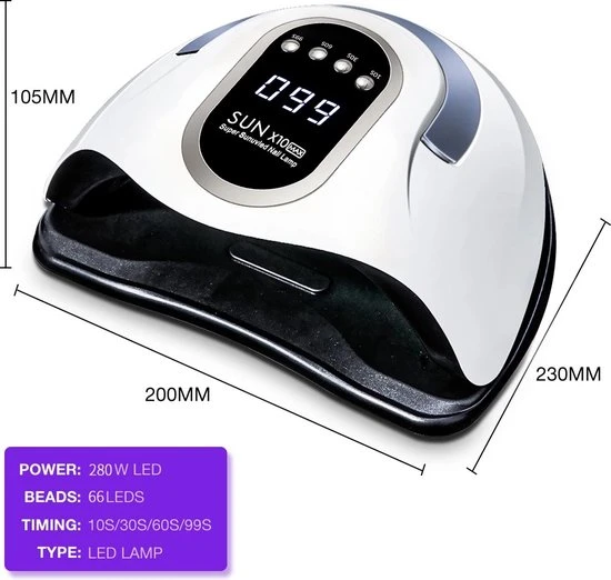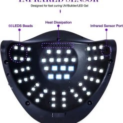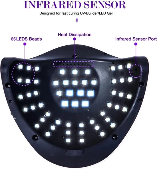 UV nagel producten als UV-gel of UV-coating hebben normaal lange tijd nodig om te drogen. Met deze extreme UV LED lamp nageldroger met wel 66 Leds lampen kunt u snel en effici?nt droge nagels krijgen en de wachttijd sterk verminderen. Bovendien heeft deze lamp 280W vermogen waardoor uw nagels sneller drogen dan de andere modellen. De UV LED lamp gaat sensor aan als u uw hand eronder legt. Ook gaat hij sensor uit als u uw hand uit de lamp haalt.