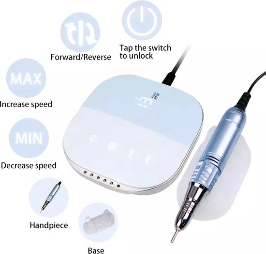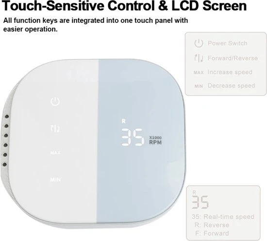 De Victoria Nails? nagelfrees is uitgerust met een touchpad, hierdoor kan je gemakkelijk met 1 vinger de snelheid aanpassen, AAN/UIT zetten, of de draairichting aanpassen. Zo zorg jij ervoor dat je de volle focus kunt houden op waar jij mee bezig bent.