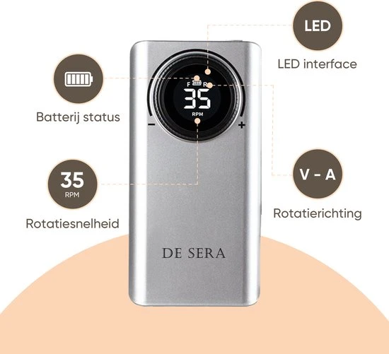 De elektrische nagelfrees van De Sera is flexibel in te stellen qua rotaties per minuut (RPM). Door de intu?tieve bediening wijzig je de rotatiesnelheid van 0 tot maar liefst 35.000 RPM. De actuele snelheid ?n de gekozen draairichting wordt op het LCD-schermpje overzichtelijk weergegeven. In combinatie met het juiste freesbitje cre?er je zo de juiste omstandigheden om jouw nagels perfect te verzorgen. Professionele kwaliteit, zoals je dat van De Sera mag verwachten.
