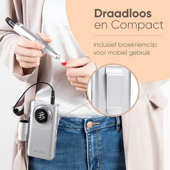 Met de draadloze elektrische nagelfrees van De Sera haal je alles in huis wat je nodig hebt voor een professionele manicure of pedicure. De nagelfrees werkt met een draadloze accupack die met een handig spiraalsnoer verbonden is aan de pen. Zet hier ??n van de 12 meegeleverde bitjes in en kies eenvoudig de juiste snelheid en draairichting. Zo heb je de perfecte tool in handen om jouw nagels professioneel te verzorgen.