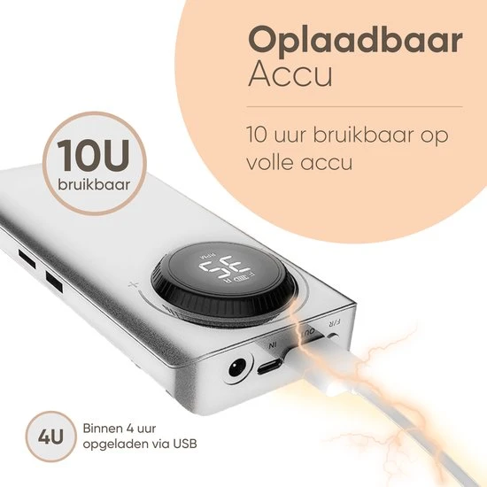 We zeiden het al eerder: de accu van deze nagelfrees is enorm sterk. Om deze optimaal te benutten, is deze daarom ook als powerbank te gebruiken. Sluit simpelweg je telefoon, tablet of ander device aan op de USB-poort van het kastje en je apparaat wordt gevoed vanuit de sterke accu. Het compleet opladen van de accu duurt slechts 2 uur, dus na gebruik is hij zo weer vol.