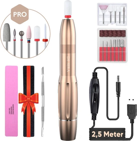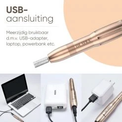 De elektrische nagelfrees werkt met een meegeleverde USB kabel van wel 2,5 meter lang. Hierdoor heb je een enorm bereik. Doordat de nagelfrees via USB werkt, is het bovendien mogelijk om de frees aan te sluiten op computer, laptop of powerbank. Hierdoor kun je je nagelfrees echt overal gebruiken.