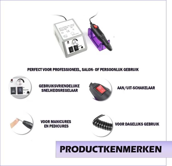 De Dermarolling Professionele Nagelfrees is een zeer complete electriche nagelfreesset is van hoge kwaliteit en geschikt voor gel enacrylnagels. Deze set is traploos in te stellen tussen 5000 en 20.0000 toeren en is zowel links als rechtsdraaiend in te stellen. Voor graveren, frezen, slijpen, vijlen en polijsten is deze nagelfrees zeer geschikt.