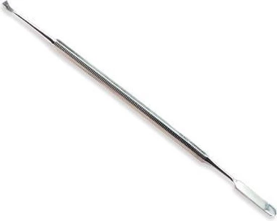 Achtkantig professioneel dubbelinstrument uit roestvrij edelstaal. Speciaal gemaakt om uitgegroeide lamillen glad te strijken en het krabben van het nageloppervlak. Dit speciaalinstrument is bijzonder goed als het gaat om nagelcorrectie. Het tweezijdige instrument is een combinatie uit nagelriemduwer, modeleermes en spatel om de nagelhuid te verwijderen + een krabber aan de andere kant. Het is makkelijk te steriliseren in autoclave of ultrasoon