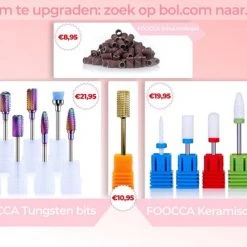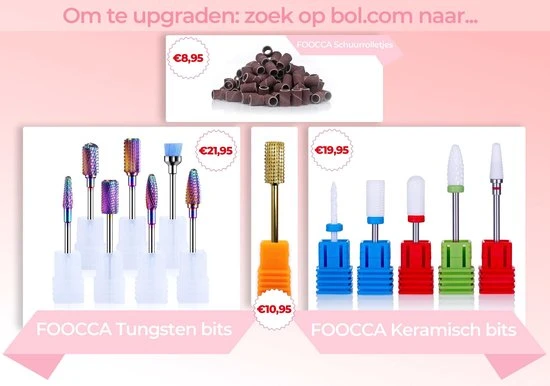 Voor degenen die een n?g betere manicure- en pedicure ervaring willen zijn er de Tungsten Carbide en Keramische bitjes/opzetstukjes van FOOCCA. Typ in de zoekbalk van bol.com naar ”FOOCCA Tungsten bits” of ”FOOCCA Keramisch bits” voor meer informatie en om te bestellen.