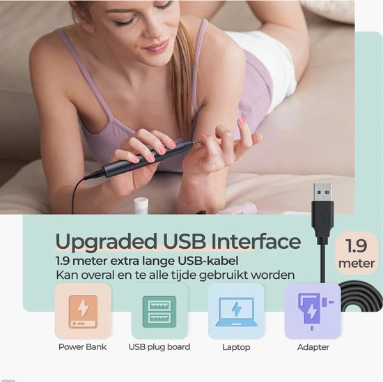Deze manicure- en pedicure set is bovendien handig voor op reis. Dankzij de meegeleverde USB-kabel (1.9 meter) kun je de nagelfrees meenemen en gebruiken waar je ook maar wilt (in combinatie met een powerbank, de USB-poort in je auto, oplaadstation op het vliegveld etc).