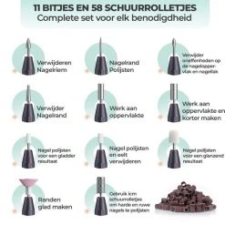 - Complete set met 11 opzetstukjes (freesjes) en 58 schuurrolletjes.