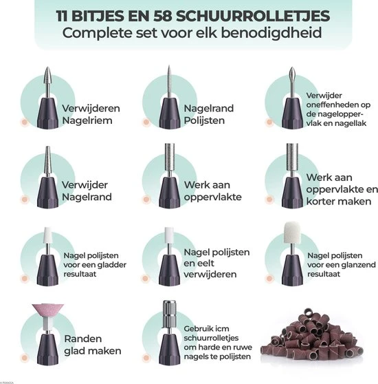 Deze manicureset & pedicureset bevat 11 multifunctionele opzetstukken. Daarmee is het geschikt om zowel gel- en acrylnagels als natuurlijke nagels te frezen, polijsten, glad en glanzend te maken. Bovendien krijg je er 58 gemakkelijk te vervangen schuurrolletjes bij voor op het mandrel bitje.