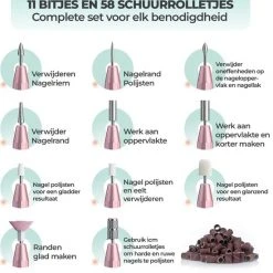 Deze manicureset & pedicureset bevat 11 multifunctionele opzetstukken. Daarmee is het geschikt om zowel gel- en acrylnagels als natuurlijke nagels te frezen, polijsten, glad en glanzend te maken. Bovendien krijg je er 58 gemakkelijk te vervangen schuurrolletjes bij voor op het mandrel bitje.