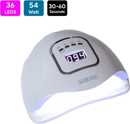 Met de nageldroger van Goodington kan je nagels 5x sneller en beter laten drogen dan normaal! De nageldroger is voorzien van 36 sterke 54 Watt LED UV-lampen en kan voor alle soorten gel nagellak en gel polish gebruikt worden! De dubbele golflengte technologie die in de nageldroger zit zorgt ervoor dat de topcoats, basecoats, builder gels of gel polish altijd een goede binding zullen krijgen. De nageldroger is voorzien met een bewegingsdetector, de lamp zal automatisch aan gaan zodra u uw hand/voet erin zet. Deze nageldroger kan zowel voor vingers of voor teennagels gebruikt worden. Voor teennagels raden wij de onderkant van de nageldroger te verwijderen.