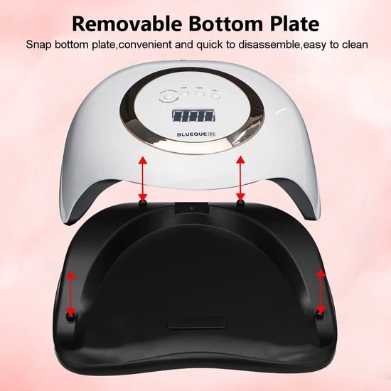 - Ons model nagellamp is een verbeterde versie, met meer ruimte, je kunt de nagellak met de hele hand drogen, bespaar tijd. En er is een afneembare bodem die gemakkelijk op je voeten kan worden aangebracht en ook gemakkelijk te reinigen is.