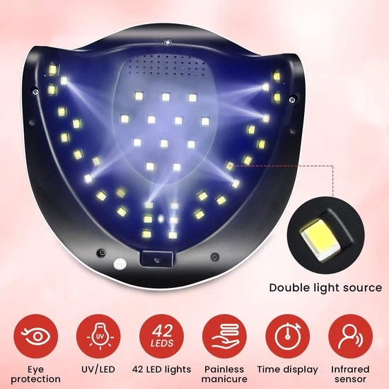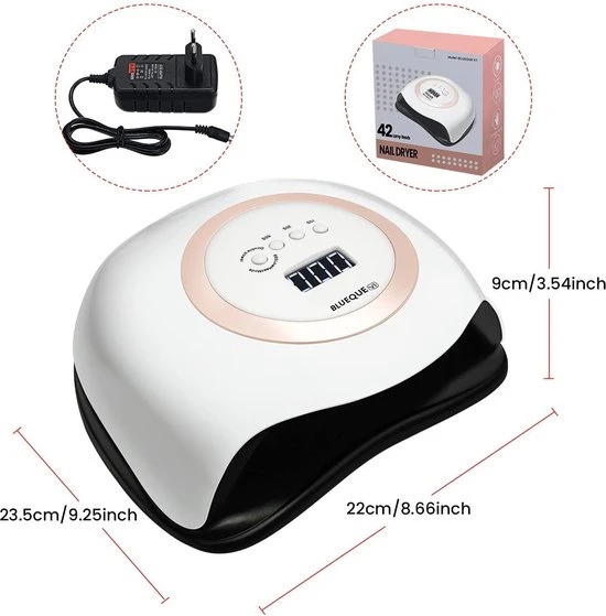 - 42 lichtbolletjes gelijkmatig verdeeld, geen dode zone, droogt nagellak in alle richtingen, snel en effici?nt. Bovendien is het licht met een speciale technologie zoals zonlicht, geen enkel uv-licht, het zal je ogen niet verwonden en geen zwarte handen meer tijdens de nageluitharding. Levering met adapter, netsnoer en Amerikaanse stekker, spanning: 100V-240V 50Hz/60Hz