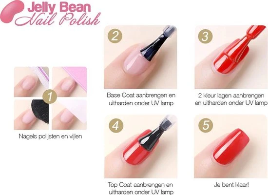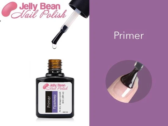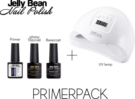 De primer wordt als eerst aangebracht en droogt zonder de UV lamp. Daarnaast kunnen de base en top coat aangebracht worden onder (base) of boven (top) ??n van de 50 kleur varianten van Jelly Bean Nail Polish.