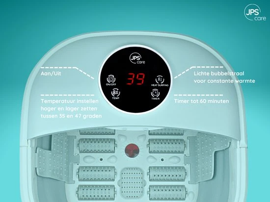 Het JPS Care® voetenbad is speciaal ontworpen om makkelijk in gebruik te zijn, niet te veel plek in te nemen in jouw woning maar toch aan al jouw behoefte te voorzien. Het voetenbad heeft massagerollers waar je met je voeten overheen kan gaan om pijnlijke voeten te verhelpen, bloedsomloop te bevorderen en jou volledige ontspanning te bieden.