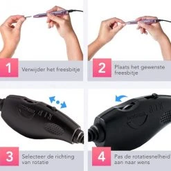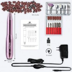- Inhoud: 1x nagelfreesmachine – 11x freesbitjes – 56x schuurrollen – 1x EU-adapter – 1x Handleiding (NL/ENG/FR)