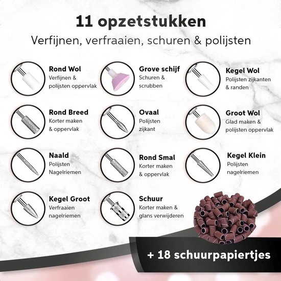 - 11 opzetstukjes: Je kunt kiezen uit 11 boortjes om je nagels af te werken. Zo kun je kiezen uit: