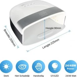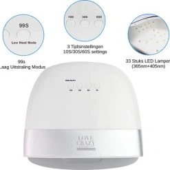 De LoveCrazy nageldroger heeft 33 sterke 48 Watt LED UV-lampen. In 30-60 seconden zijn de nagels van je hand of voet droog en uitgehard. Basecoats, topcoats, gelpolish of builder gels, je hebt altijd perfecte polymerisatie dankzij de dubbele golflengte technologie. Bewegingssensoren zetten de nageldroger automatisch aan en uit, dus je verpest nooit meer natte nagels aan knopjes! Kies uit handige opties zoals een low-heat functie, 4 timers (10s,30s,60s,99s). De perfecte nageldroger voor thuis of in de salon!