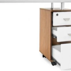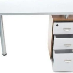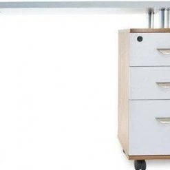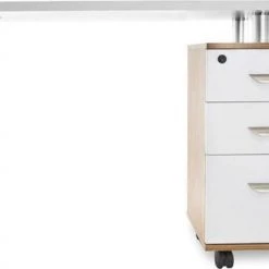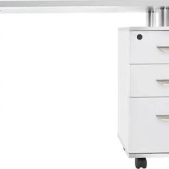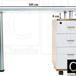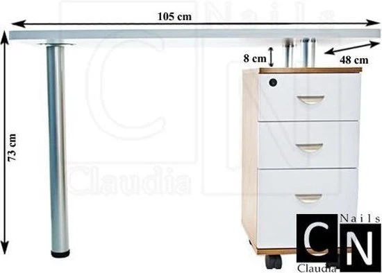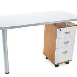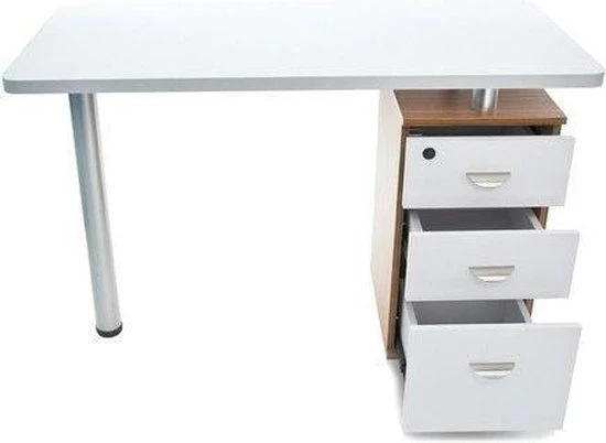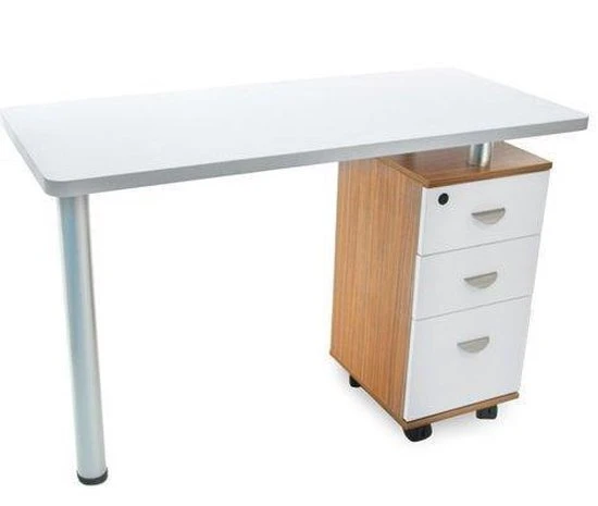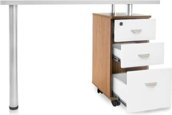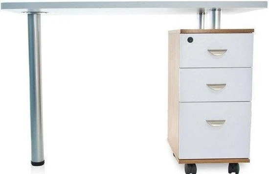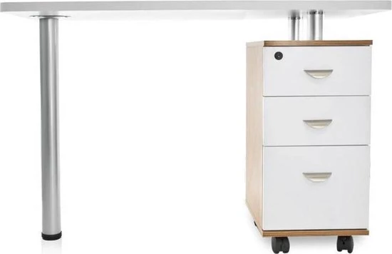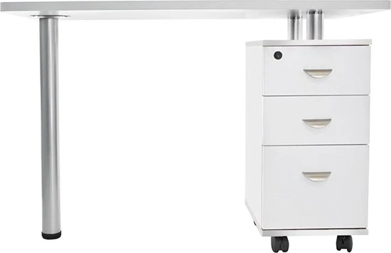 Deze stabiele manicuretafel is voorzien van een ladekast. De ladekast bestaat uit drie laden waarvan 1 met slot. Door de wielen is de tafel stabiel en makkelijk verplaatsbaar.