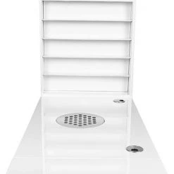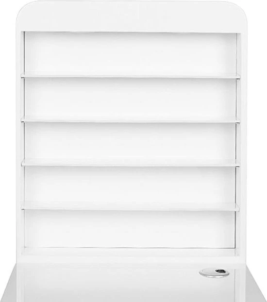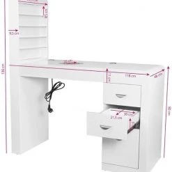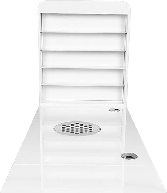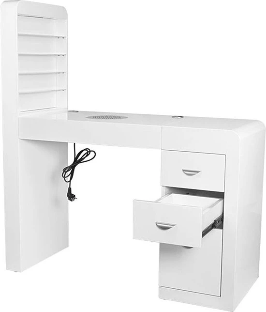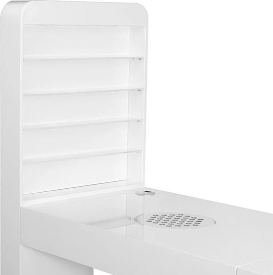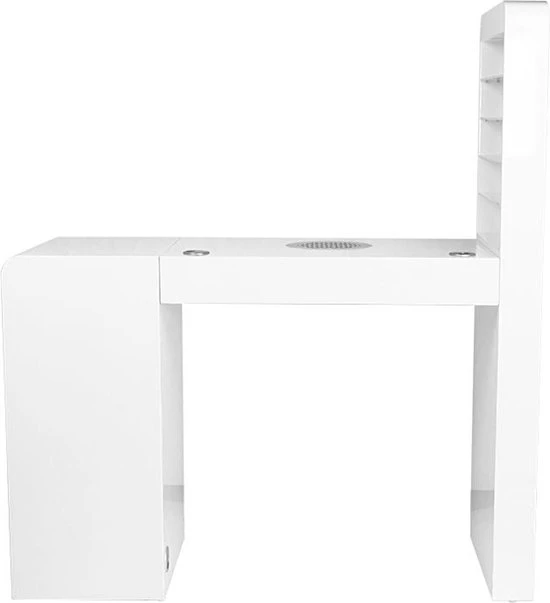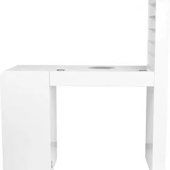 Een zeer functionele manicure tafel voor uw salon welke drie functies combineert: ruime werktafel, afzuiging welke is ingebouwd in de tafel en voldoende opberg ruimte voor uw producten + een handige wand voor het displayen van uw bijvoorbeeld uw gellak, glitters of acryl. De tafel heeft een tijdloze uitstraling en zal goed passen bij diverse stijlen en is voorzien van een handig kastje voor het netjes opbergen van uw spullen. Daarnaast is de tafel voorzien van 2 speciale uitsparingen voor kabels van bijvoorbeeld uw lamp of freesmachine, zodat deze niet in de weg liggen op uw werkplek.