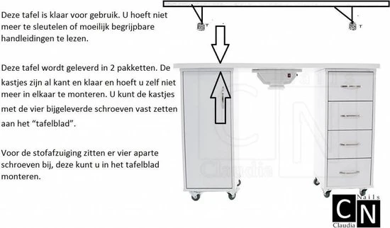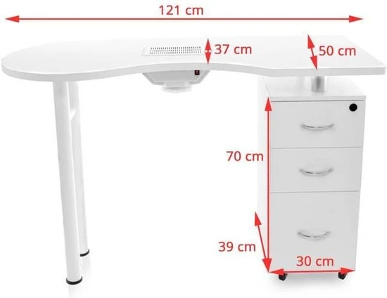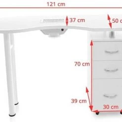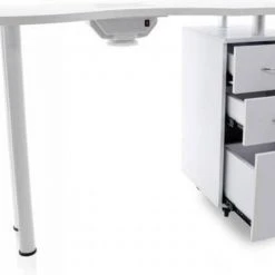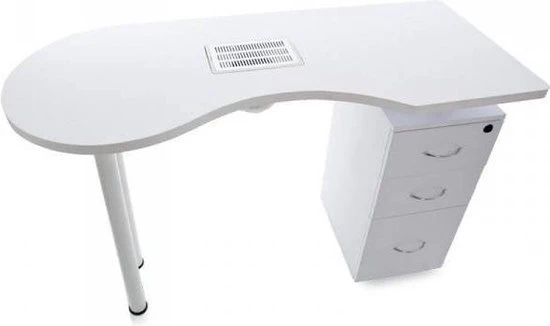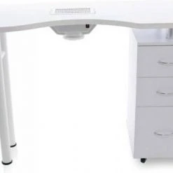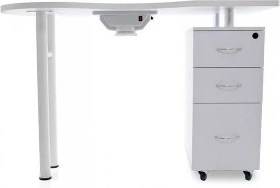 Deze stabiele manicuretafel is voorzien van een ingebouwde stofafzuiging en een ladekast. De ladekast bestaat uit drie laden waarvan 1 met slot.