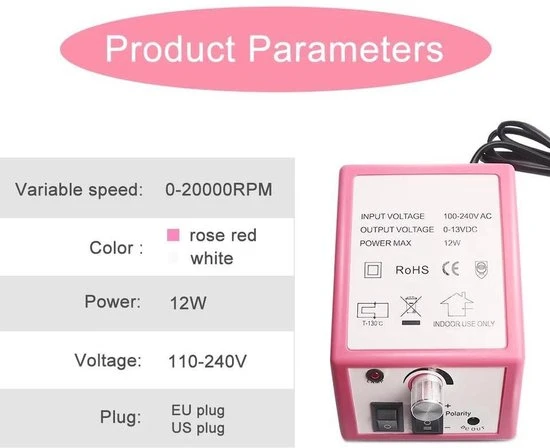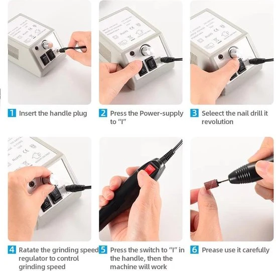 Pakket bestaat uit: 1 x Professionele Nagelfrees Machine (Inclusief snelheid aanpasser) 1x Nagelfrees opzetstuk 6 x Diverse freesbitjes 6 x Schuurrolltjes 1 x Netsnoeradapter