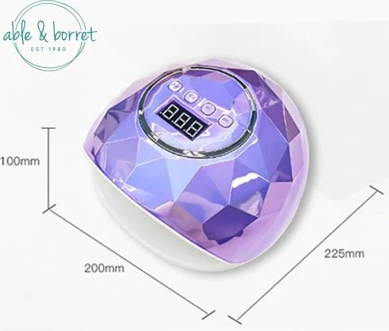 Met de Able & Borret nageldroger met UV-lamp is het mogelijk om gelnagels op de best mogelijke wijze te drogen. De lamp is voorzien van een set met 42 ledlampjes die gebruikt worden voor het drogen van gellak. De knoppen op het apparaat gebruik je voor de bediening. Tijdens het gebruik heb je de mogelijkheid om de droogstand in te stellen op een tijd van 10, 30, 60 of 90 seconden. Het apparaat is voorzien van een infrarood sensor. Daarmee detecteert het toestel automatisch wanneer er een voorwerp in geplaatst wordt zoals een vinger of hand. Hiermee wordt de UV-lamp automatisch geactiveerd. De voet van het apparaat is magnetisch en eenvoudig te verwijderen. Hierdoor kun je de droger eenvoudig schoonmaken na gebruik.