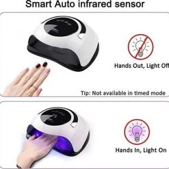 De SUN 5BQT heeft 4 tijdinstellingen, zo kunt u kiezen tussen 10 sec, 30 sec, 60 sec of 99 sec (lage warmte modus). De lage warmte modus is ideaal bij klanten die wel eens een brandend gevoel ervaren. De lamp werkt automatisch wanneer u uw hand in de lamp plaatst, de timer geeft duidelijk de tijd aan.