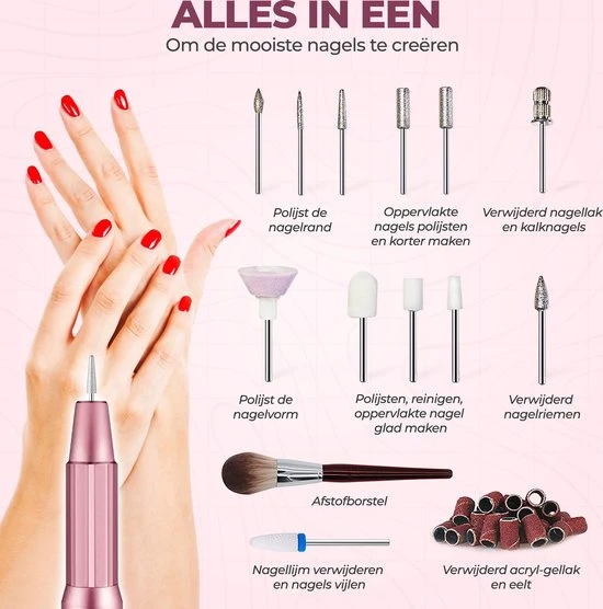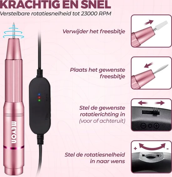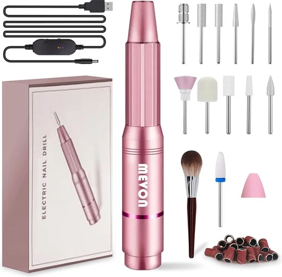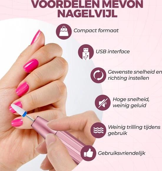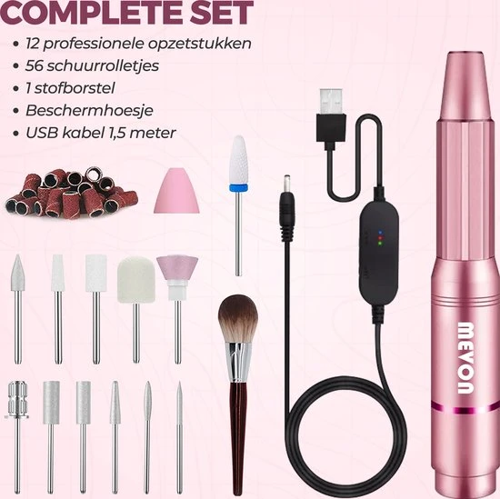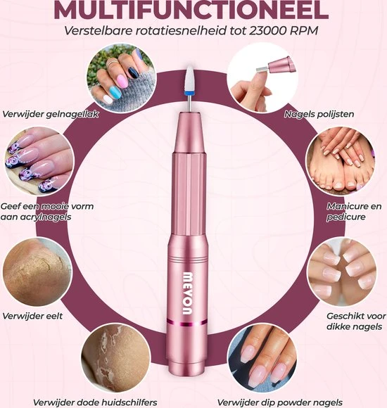 Met de MEVON elektrische nagelvijl voor manicure- en pedicure is handmatig nagelvijlen verleden tijd! Ga vanaf nu sneller en nauwkeuriger te werk, met als resultaat mooi verzorgde en gezonde (teen)nagels. De krachtige nagelvijl is niet alleen geschikt voor natuurlijke nagels maar ook voor gel- en acrylnagels. Met de 12 meegeleverde nagelfrees bitjes, 56 schuurrolletjes en stofborstel kun je op een professionele manier je nagels polijsten, vijlen, frezen, glad en glanzend maken. Ook geschikt voor het behandelen van kalknagels, dode huidschilfers én hardnekkig eelt.