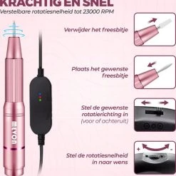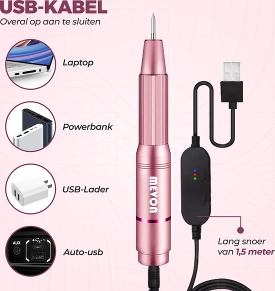 De draairichting van de nagelfrees kan voor en achteruit ingesteld worden, waardoor de nagelvijl voor rechts- en linkshandig gebruik geschikt is. De snelheid van rotatie is aan te passen van 500 tot 23000 RPM. Zo kun je moeiteloos je natuurlijke nagels vijlen met een zachte stand of met een krachtige stand gellak verwijderen. Dankzij het meegeleverde snoer met USB-aansluiting kun je de nagelfrees overal gebruiken. Sluit het gemakkelijk aan op bijvoorbeeld een laptop, USB-lader of powerbank.