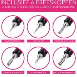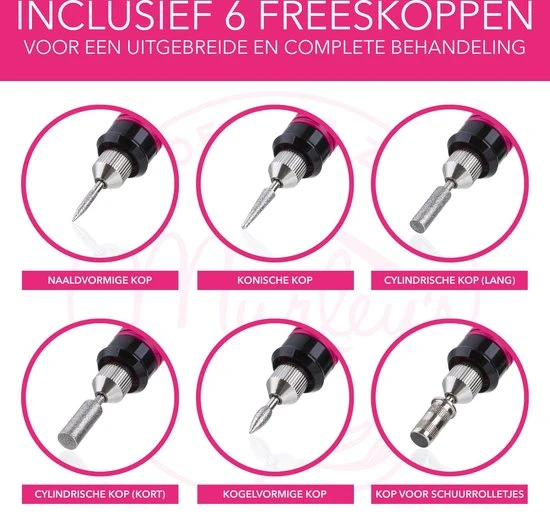 De elektrische nagelvijl heeft een handstuk met een snelheid van 20.000 toeren per minuut (rpm). Het apparaat wordt geleverd met 6 nagelfrees bitjes en 6 schuurrolletjes zodat je meteen aan de slag kan.