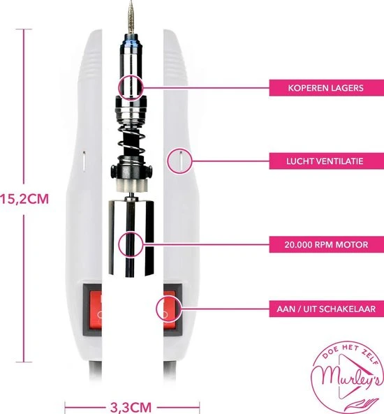 Met Murley?s 20000 elektrische nagelfrees kan je je nagels zelf met gemak vanuit thuis doen. Deze betaalbare nagelvijl is alles wat je nodig hebt voor zowel natuurlijke als kunstmatige nagels. De ideale manicure en pedicure set voor thuis. Bespaar tijd en geld met deze doe-het-zelf nagelfrees!