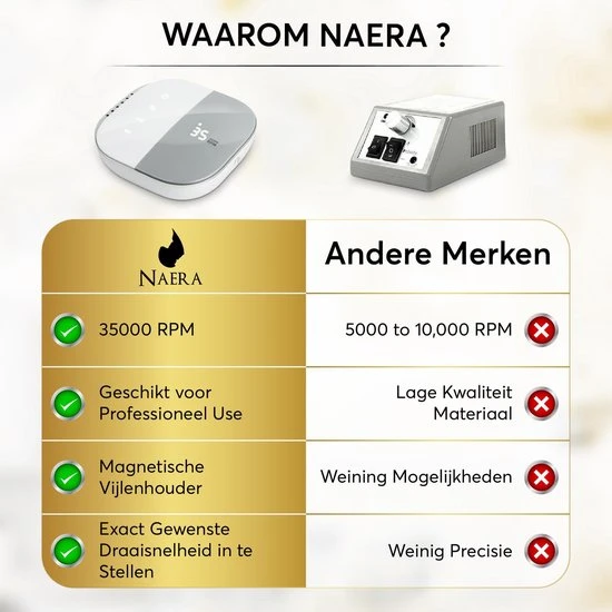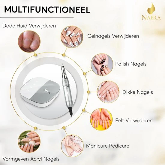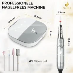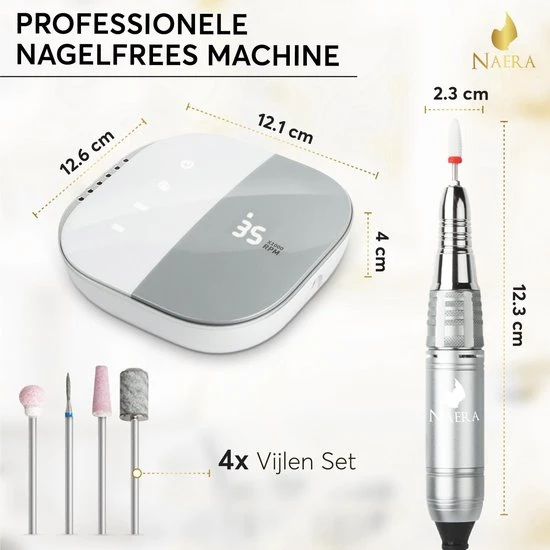 Doe vandaag eens echt iets voor jezelf en bestel de elektrische nagelfrees van Naera! Een professionele manicure set met 4 vijlen, simpel te bedienen base unit en ergonomisch ontworpen freespen. Ideaal voor thuisgebruik, past perfect in de beautysalon en zeer geschikt voor mensen met spier- en gewrichtsklachten! De aluminium nagelfrees machine maakt gebruik van maximaal 35.000 RPM en is extra zacht in zijn geluid en trilling. Het leven is niet perfect, maar je nagels kunnen dit wel zijn!