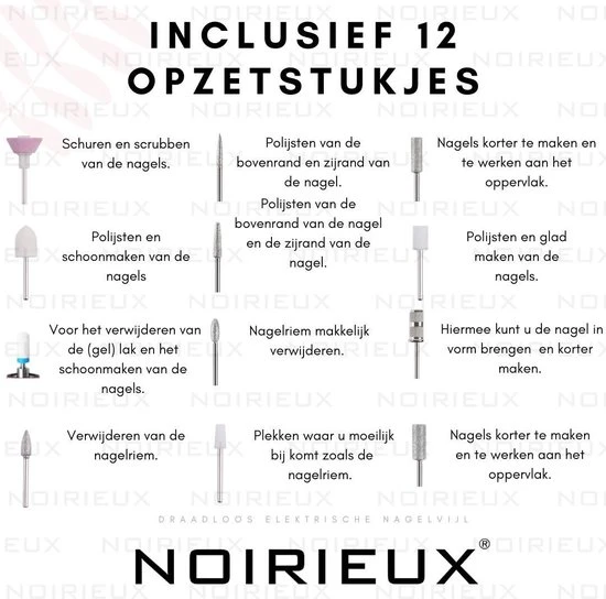De elektrische nagelvijl wordt geleverd met schuurrollen en 12 professionele nagelfrees bitjes. De Elektrische nagelvijl is erg stil, bovendien kan de elektrische nagelvijl 2 kanten opdraaien zodat het geschikt is voor links en rechts. Behandel nu je vinger- en teennagels snel, gemakkelijk, en professioneel zonder de deur uit te gaan. Ook is deze draadloze elektrische nagelvijl makkelijk te gebruiken voor het verwijderen van gel en kunst nagels.