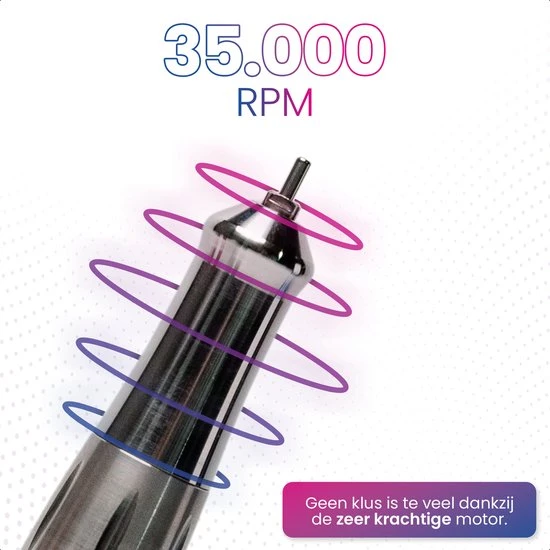 Om in iedere situatie op een perfecte manier de nagels de verzorgen, is de nagelfrees uitgerust van een sterke motor. Deze zorgt voor een rotatie van 35.000RPM, waarmee je nagels er altijd fantastisch uit zullen zien. Het aantal toeren is simpel aan te passen door aan het wieltje op de voorkant te draaien. Wanneer je deze variabele snelheid combineert met de vele professionele opzetstukken, zullen je nagels er beter uitzien dan ooit.