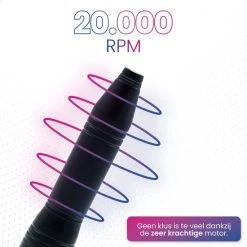 Om in iedere situatie op een perfecte manier de nagels de verzorgen, is de nagelfrees uitgerust van een sterke motor. Deze zorgt voor een rotatie van 20.000RPM, waarmee je nagels er altijd fantastisch uit zullen zien. Het aantal toeren is simpel aan te passen door aan het wieltje op de voorkant te draaien. Wanneer je deze variabele snelheid combineert met de vele professionele opzetstukken, zullen je nagels er beter uitzien dan ooit.