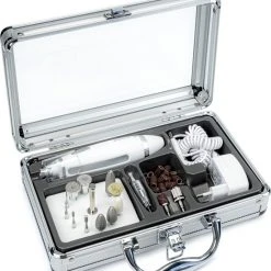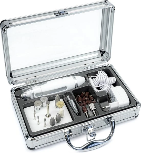 De professionele nagelverzorgingsset bevat 15 hoogwaardige opzetstukken van saffier en vilt. Alle hulpstukken zijn ook afzonderlijk verkrijgbaar als accessoire. In de aluminium koffer bevinden zich 15 opzetstukken: