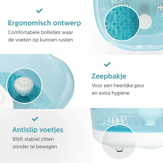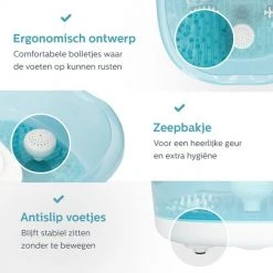Het voetenbad is speciaal ontworpen voor ultiem comfort. Zo is de bodem voorzien van comfortabele bolletjes waar de voeten op kunnen rusten. Het voetenbad is bovendien voorzien van een bakje waar bijvoorbeeld zeep in kan worden gedaan, voor extra verzorging en een heerlijke geur. De onderkant van het voetenbad is voorzien van antislip, waardoor deze stevig blijft staan tijdens gebruik.