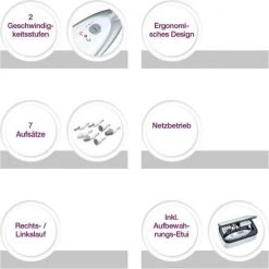 Het heeft zeven verschillende opzetstukken voor nagels van handen en voeten.Het heeft een krachtige werking via netvoeding met tandwielmechanisme.