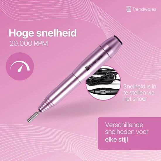 Deze elektrische nagelvijl is zo fijn in gebruik dat hij niet ten onder doet aan een professionele nagelvijl door de krachtige motor. De continue toevoer van stroom zorgt voor een evenredig resultaat. De snelheid van de vijl wordt aangepast door een handig draaiwiel aan het snoer.