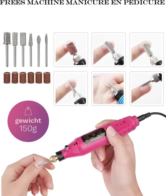 Met de Manicure- en pedicureset haal je een professionele nagelstudio in huis! Zeer compact in formaat, maar uitgebreid in functionaliteit. Inclusief 6 nagelfrees opzetstukjes en 6 schuurpads welke je nagels mooi en gezond houden. Polijsten, vijlen, exfoli?ren, alles kan! De nagelfrees draait zowel voor- als achteruit en is dus zowel de linker- als de rechterhand te gebruiken. Met een laag geluidsvolume, weinig vibraties en een aanpasbare snelheidvoor zowel de ervaren als beginnende nagelartiest