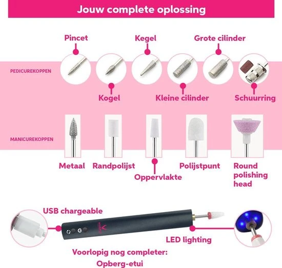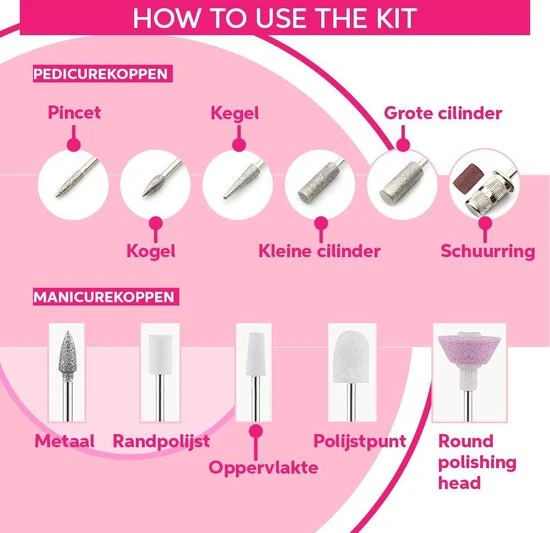 – Ronde polijstkop (zachter maken van de randen na het nagelknippen).