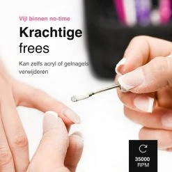 De nagelfrees machine is voorzien van 50W vermogen waardoor deze snel je nagels kan vijlen of polijsten. Je kunt de snelheid aanpassen tot maar liefst 35.000 rpm, waardoor je zelfs gelnagels en acryl kunt verwijderen!
