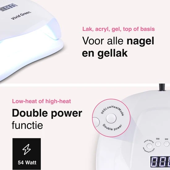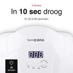 Onze Vivid Green Nageldroger zorgt ervoor dat je nagels binnen no-time droog zijn en je weer stralend de deur uit kan! De gellak lamp bevat drie timers, een low heat functie en intelligente handherkenning om je nagels optimaal te drogen en harden. De nagellamp is voorzien van 36 krachtige UV-ledlampen van 54W die de droogtijd verlagen!