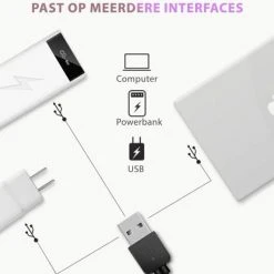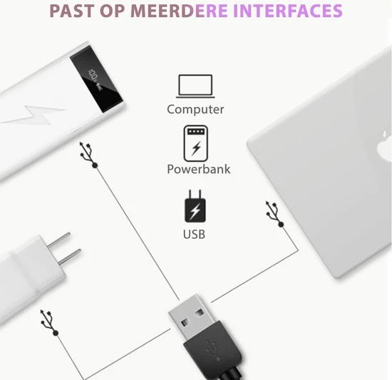 – Oplaadbaar en aansluiting via USB: Stekker, computer en powerbank