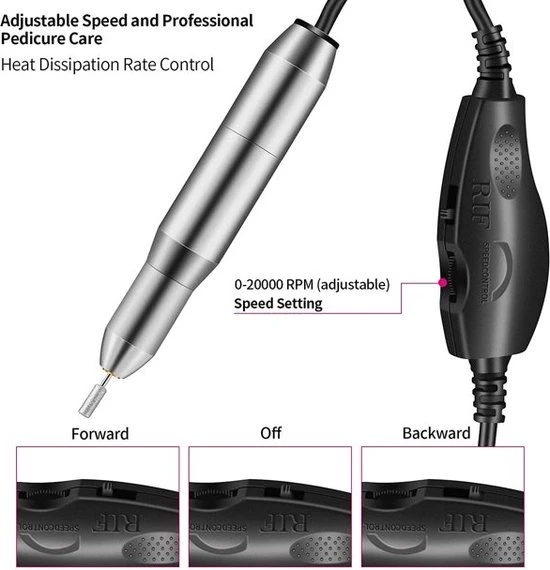 De nagelfrees is zowel met de linker- als met de rechterhand te bedienen. Met de schuif op het adaptersnoer kan jij namelijk zelf instellen of je de nagelfrees voor- of achteruit wilt laten draaien. Plus, met de andere schuif op het snoer kan je de snelheid aanpassen. Zo kan je bijvoorbeeld krachtig je nagels vijlen of ze zacht polijsten. Een vlekkeloze manicure op een geheel veilige manier dus!